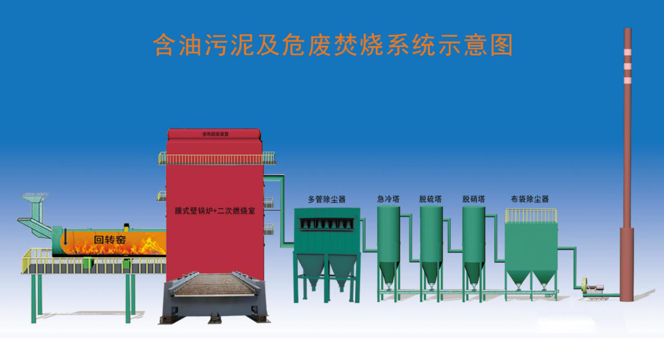 通過焚燒將含油污泥、磺化污泥進(jìn)行處理,其需借助天然氣使污泥燃燒釋放高溫?zé)幔渲锌扇嘉锶紵?,不可燃物以粉塵形式回收,最終實(shí)現(xiàn)企業(yè)廢物處置的節(jié)能化、減量化、無害化、資源化的目標(biāo)。本工藝裝置采用焚燒法直接處理,焚燒加余熱回收是本裝置的特點(diǎn)之一。